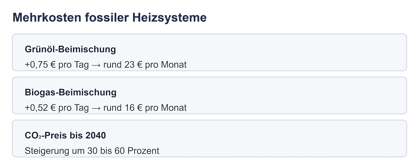 Dies führt zu höheren Brennstoffkosten und steigenden CO₂-Abgaben über die Lebensdauer der Heizung. Die Mehrkosten für Haushalte betragen etwa 16 € monatlich durch Biogas-Beimischung, 23 € durch Grünöl und eine CO₂-Preissteigerung von 30–60 % für fossile Systeme bis 2040. Dies kann zu einer Kostenfalle führen, denn fossile Heizungen sind in der Anschaffung günstiger, aber im Betrieb deutlich teurer .