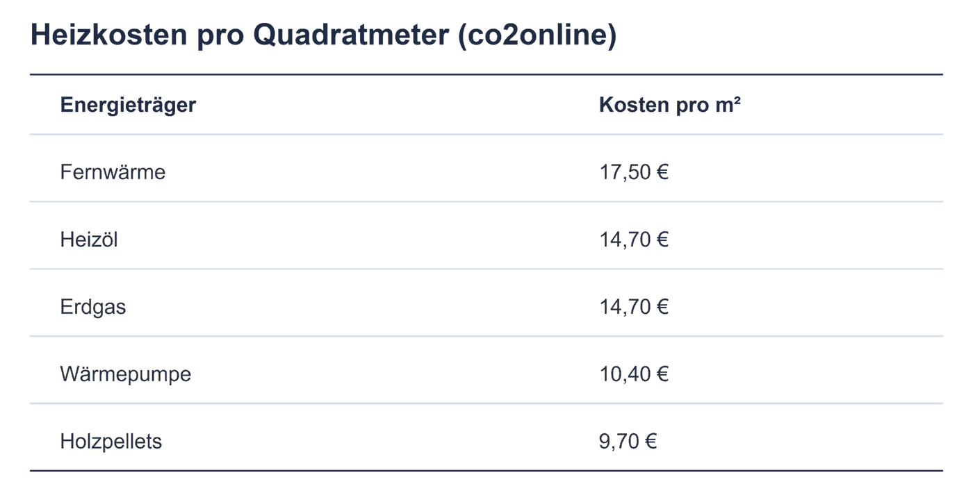 Aktuelle Heizkosten pro Quadratmeter zeigen, dass Wärmepumpen (10,40 €/m²) und Holzpellets (9,70 €/m²) heute die günstigsten Betriebsvarianten sind, während Fernwärme, Heizöl und Erdgas teurer sind.