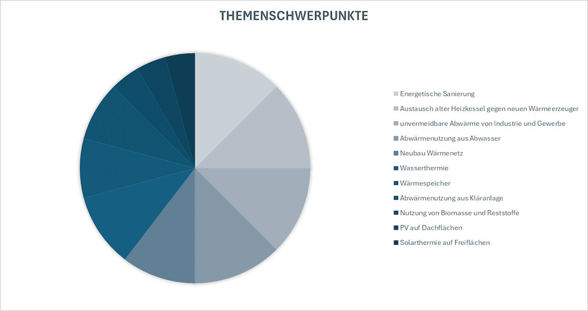 Die Kommunen setzen klare Prioritäten: Besonders hoch bewertet werden energetische Sanierungen und der Austausch alter Heizkessel – jeweils sechs Stimmen. Ebenfalls stark im Fokus steht die Nutzung unvermeidbarer Abwärme, sowohl aus Industrie und Gewerbe als auch aus Abwasser (jeweils sechs Stimmen).